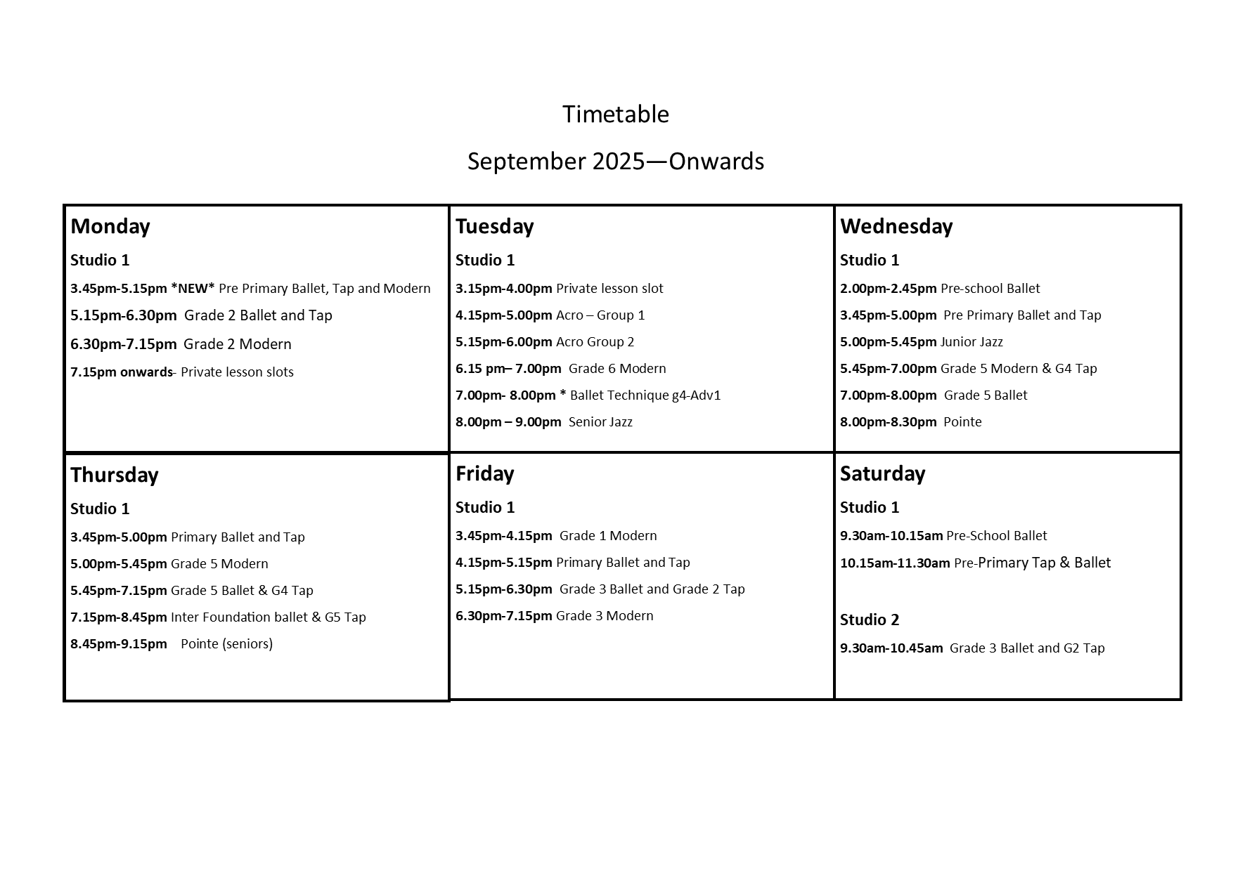 Timetable September 2025 onwards